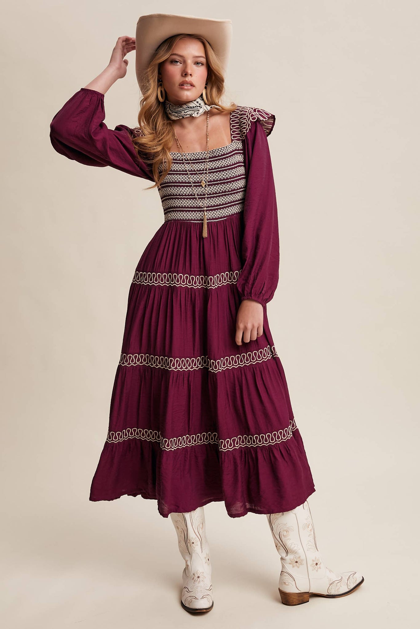 - Fabric: Lightweight woven cotton-blend with full lining for comfort - Bodice: Smocked front and back with textured horizontal embroidery for a secure, stretchy fit - Sleeves: Long bishop sleeves with elastic cuffs for added volume - Embroidery: Decorative embroidered detailing along the tiered skirt and ruffled shoulders - Skirt: Full, tiered maxi silhouette with subtle gathers for graceful movement - Features: Includes side pockets for functionality - Model is 5' 9" 32-24-34 and wearing a size Small A prairie-chic silhouette with delicate embroidery and effortless charm built for every adventure.