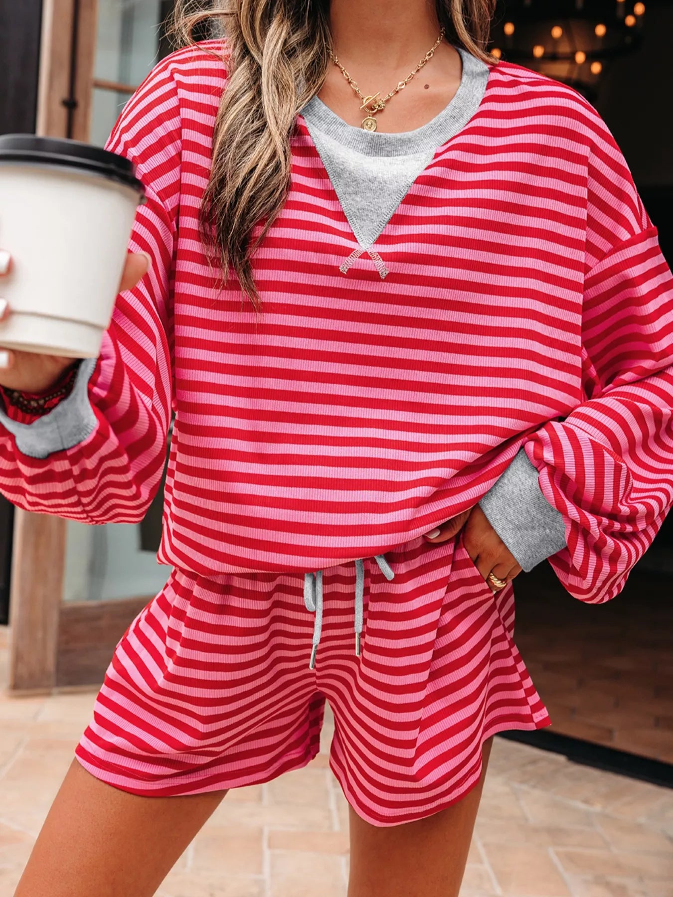 Stripe Drop Shoulder Baggy Top and Shorts Casual Set